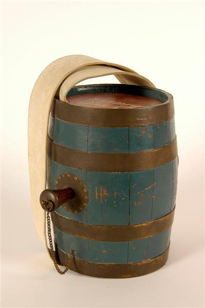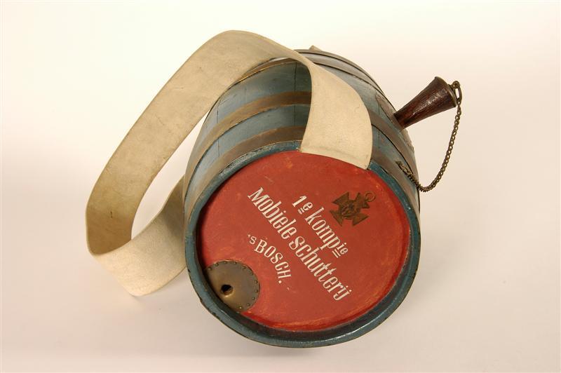 Tonnetje met bandelier, voor marketentster. Naar model 1830 van vrouw Leuwer. Tonnetje van blauw gelakt hout, met 4 koperen banden. Bodem rood gelakt. Midden boven, op een van de duigen, een rond koperen plaatje met gat. Daarnaast is een koperen ketting vastgemaakt waaraan een houten stop, passend in het gat. Op een bodem een koperen plaatje met gat voor de aansluiting van de koperen kraan. De kraan past echter niet in dit gat. Kraan met houten hendel en kurk. Aan beide zijden van het tonnetje is een witte leren bandelier bevestigd. Tonnetje waarschijnlijk een imitatie van het originele model. Op een bodem is met witte verf geschreven: Vrouw Leuwer. Op de andere bodem is bovenaan het metalen kruis geschilderd. Daaronder is in het wit het opschrift "1e komp1e / Mobiele Schutterij / 'S BOSCH" aangebracht