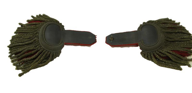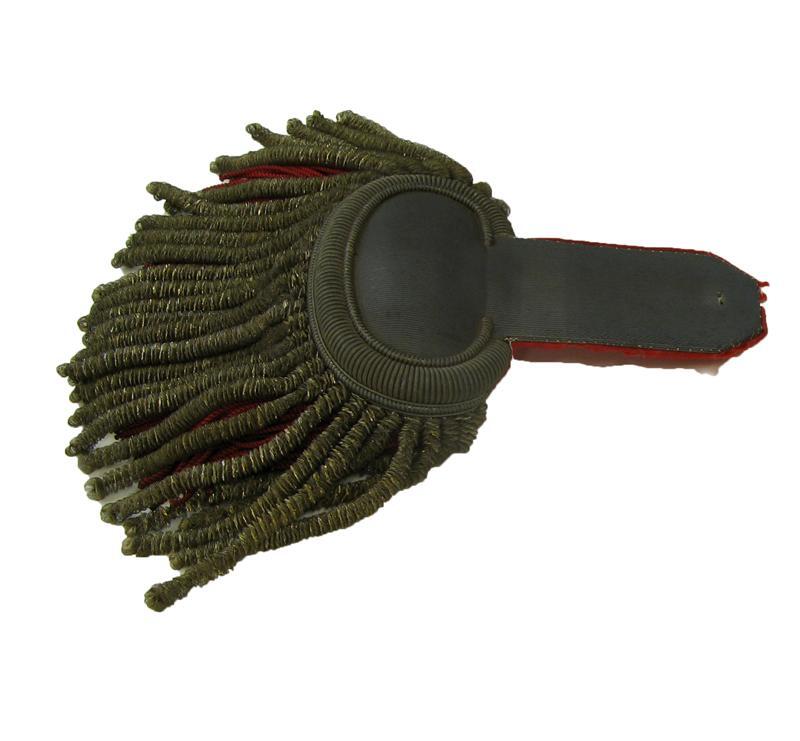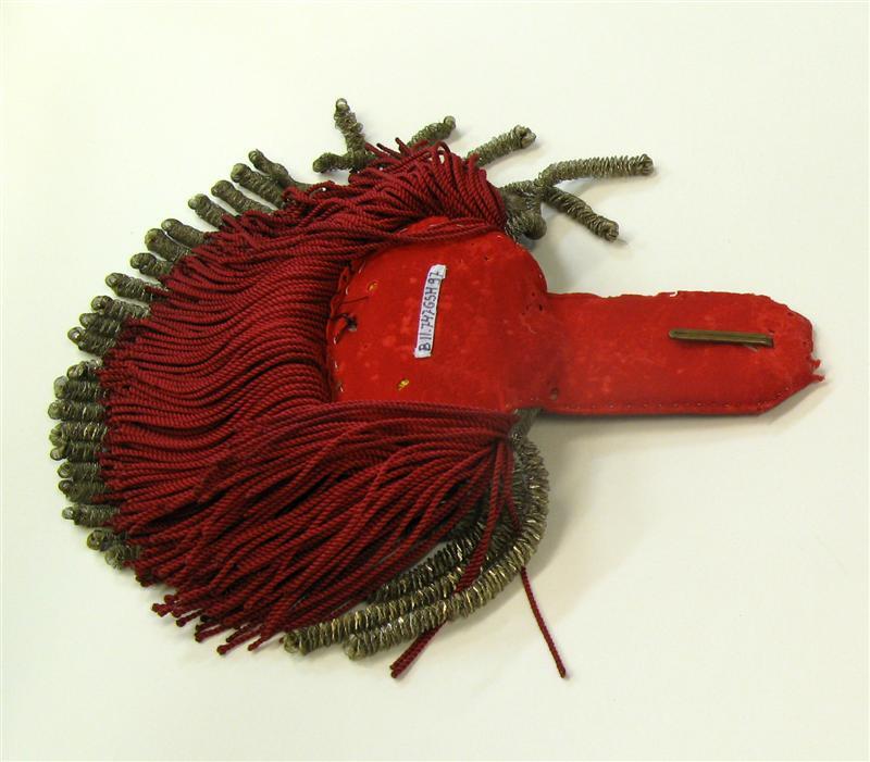 Model 23 mei 1860, voor tamboer-majoor. Epauletten zonder strepen in het zilverband, met dikke franje van zilverdraad en franje van rode zijde. Al het toegepaste metaaldraad is zilverkleurig. Op de bovenzijde een gebombeerde metalen knoop met stedekroon en randversiering. Op de onderzijde een koperen haak. Voering van rood laken. Behorend bij jas inv.nr. 11747.057.