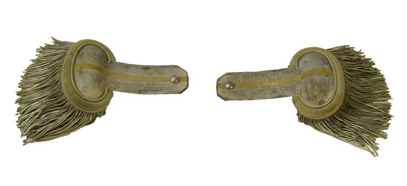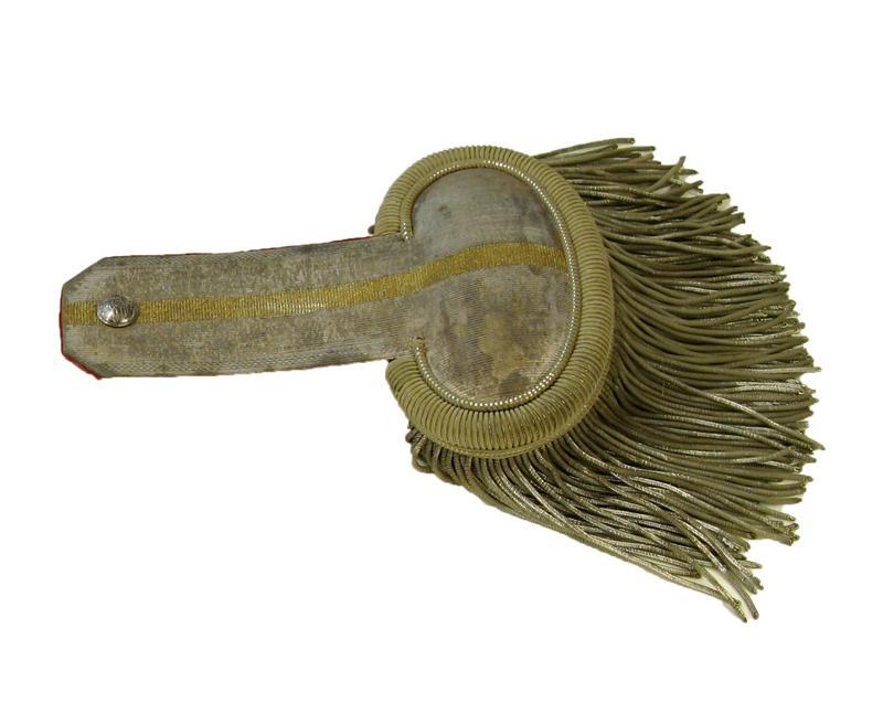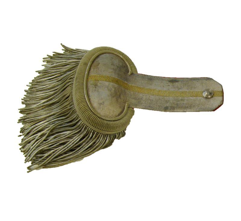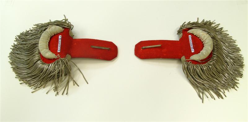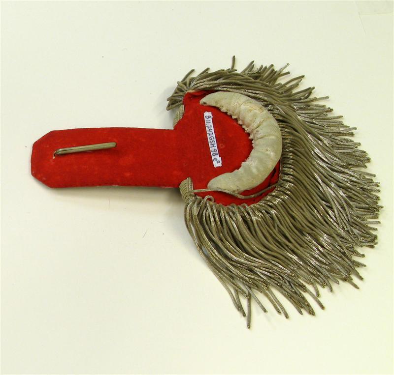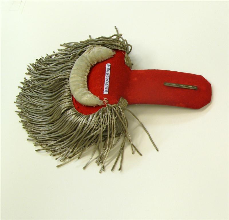 - BeschrijvingKenmerken: 1e luitenant: dunne franje, een streep. Uitvoering: kussentje van witte wol, opgevuld met wit katoenen garen. Gevoerd met fel rood laken.