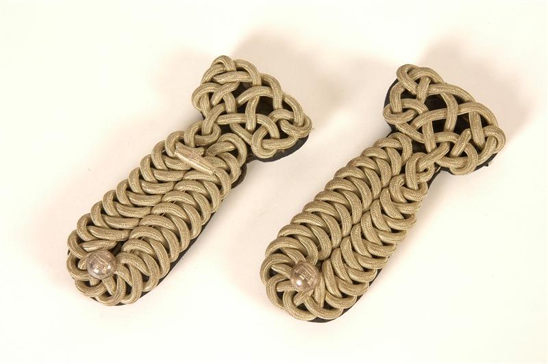 - BeschrijvingVan dun dubbelgevlochten zilverkoord op een voering van donkerblauw laken (over karton? genaaid). Op ieder exemplaar bovenaan en in het midden een paar zwarte veters. Haken van metaal