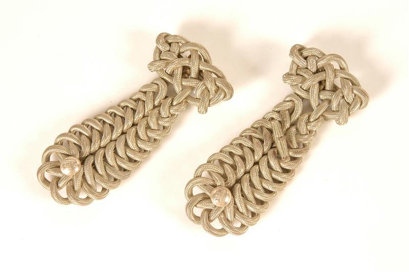 - BeschrijvingVan dun dubbelgevlochten zilverkoord. Grote haken van glad ?? Kleine haken van metaal met versieringen.