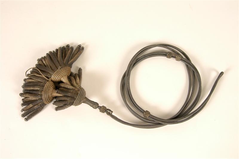 - BeschrijvingModel 24 oktober 1867, voor majoor. Fouragère met 3 zilveren kwasten van bouillons, een boven en twee onder. De bovenste kwast heeft een ring van 16 dikke zilverbouillons. De beide onderste kwasten hebben elk een buitenring van 15 dikke en een binnenring van 10 dunne zilverbouillons. De overige gegevens zijn gelijk aan die van inv.nr. 11747.112.