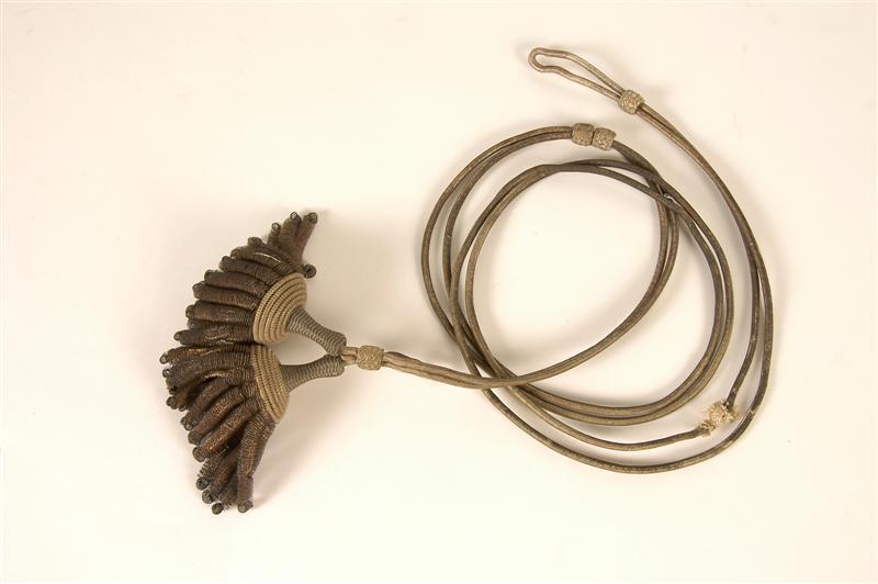 - BeschrijvingModel 24 oktober 1867, voor kapitein. Fouragère met 2 zilveren kwasten van bouillons, naast elkaar. De kwasten hebben elk een buitenring van 15 dikke en een binnenring van 10 dunne zilverbouillons. Er is geen lus tussen de twee aan elkaar gehechte kwasten bevestigd. De overige gegevens zijn gelijk aan die van inv.nr. 11747.112.