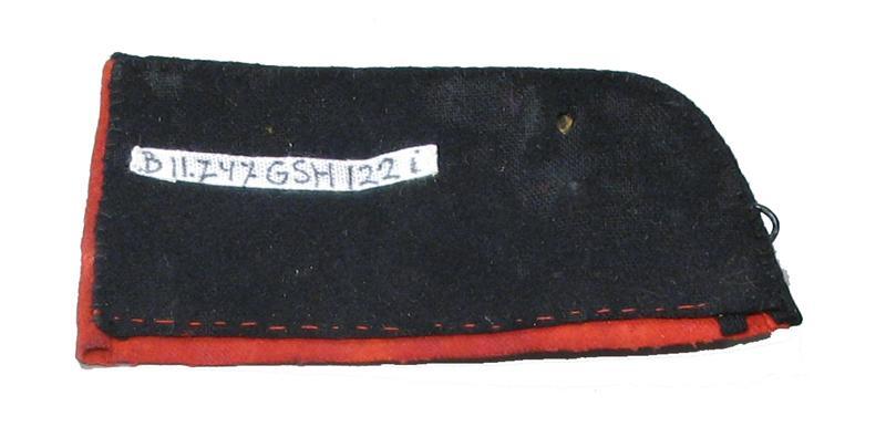 - Beschrijving2e luitenant: 1 gouden ster. Kraag: rood laken, gebiesd met donkerblauw laken. Voering: donkerblauw laken. Midden voor op de rand een zwart metalen oogje.