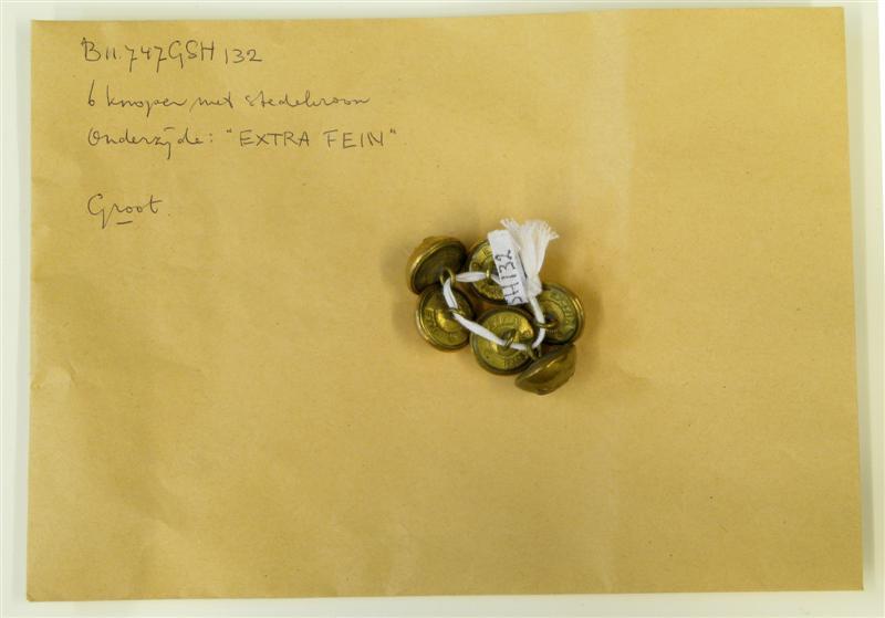 6 koperen, gebombeerde knopen met stedekroon. Groot model. Omschrift rond gepunteerde rand op de onderkant EXTRA FEIN
