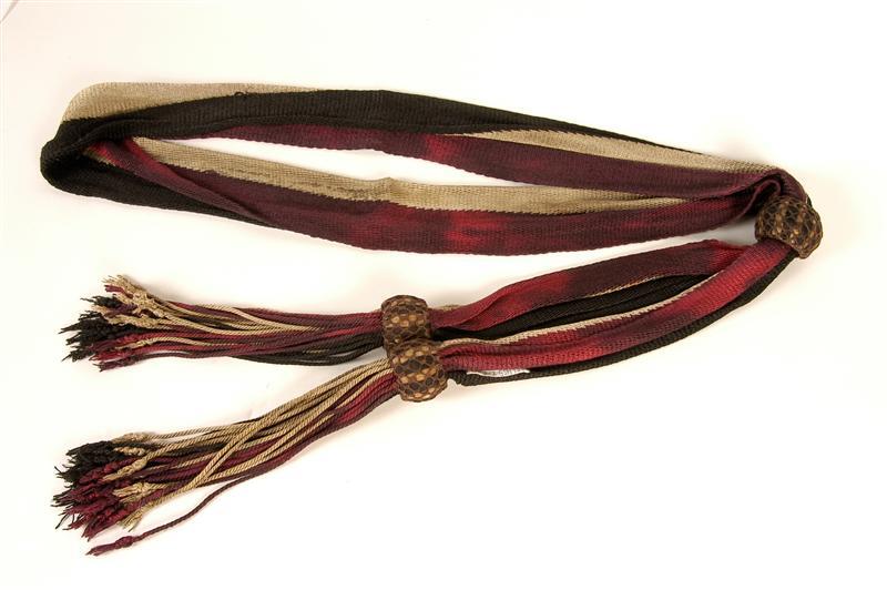 Rood-wit-blauwe (of zwarte?) sjerp van zijden vlechtwerk. Over de dubbelgevouwen sjerp is een grote ring geschoven. Aan begin en einde van de sjerp zijn kleinere ringen bevestigd. Onder aan deze ringen hangen franjes. Franje in de kleuren (paarsachtig) rood, wit en donkerblauw (zwart?). Ringen van touw omwonden met donkerblauw en wit garen. Daaromheen een netje van (paarsachtig) rode zijde. De 2 onderste ringen zijn aan elkaar genaaid. De sjerp maakte deel uit van het uniform van een officier van de Gewapende Burgermacht.
