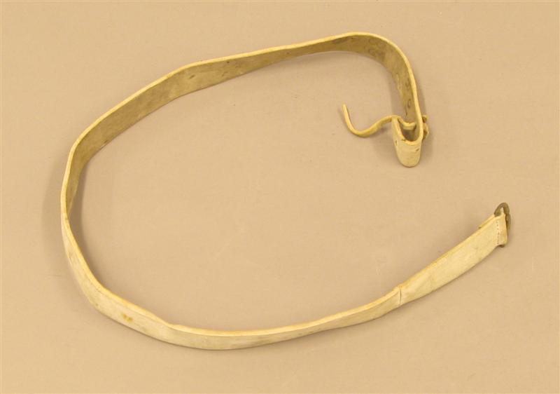- BeschrijvingWitte leren riem met koperen gesp aan een uiteinde. In het andere 4 gaatjes en een door een gat gehaalde witte leren veter. Op 12 cm van de gesp een gat in het midden, op 85 cm een gaatje uit het midden. Op 4.5 cm van het andere uiteinde een gaatje uit het midden.