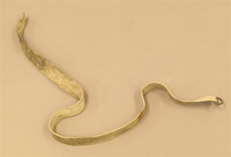 - BeschrijvingWitte leren riem met koperen gesp. Gaatje op 54.5 cm van de gesp in het midden. Telkens 2 gaatjes naast elkaar op 1.2 cm, 5.6 cm, 17 cm en 19 cm van het andere uiteinde van de riem. Een afgesneden hoek aan dit uiteinde. Door de laatste gaatjes is een touwtje gehaald.