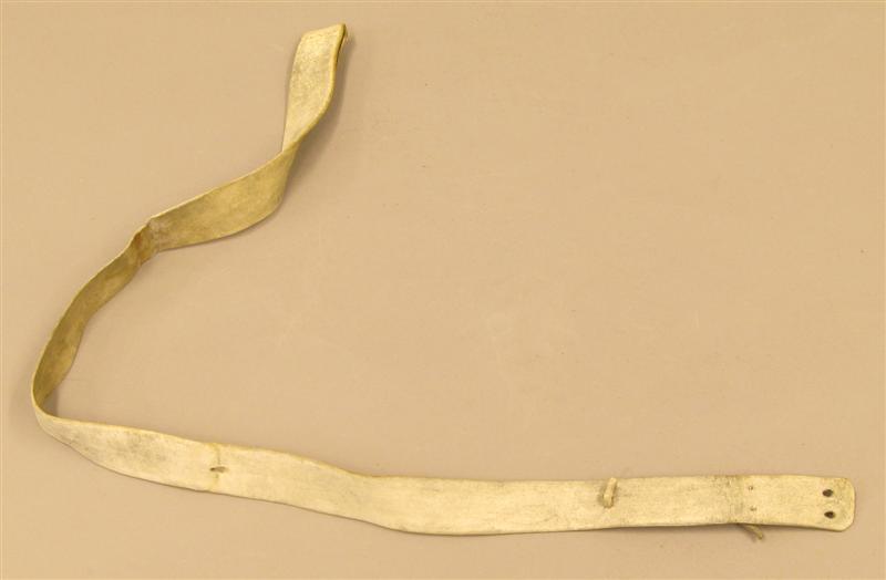 - BeschrijvingWitte leren riem met koperen gesp (?). Gaatje op 54 cm van de gesp in het midden. Op 1.2 cm., 6.2 cm, 15 cm van het andere uiteinde, telkens 2 gaten naast elkaar. Door de laatste is een witte leren veter gehaald.