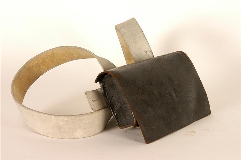 Model ca 1808. Patroontas van zwart gelakt leer met grote, recht afgesneden klep. Op de voorzijde, onder de klep, een vakje, te sluiten met een leren knoop en een doorgeschoven leren bandje. Naast dit vak een zakje, aan de bovenkant schuin afgesneden. Boven dit zakje een doorgeschoven leren bandje. Op de achterzijde een leren band, zo opgenaaid dat 2 sleuven gevormd worden. Door deze sleuven wordt de bandelier geschoven. Op de onderkant 2 metalen gespen met leren lussen, ter bevestiging van de bandelier. Daartussen een metalen gesp met leren lusje, behorend bij het riempje dat onder de grote klep genaaid is. Onder de grote klep een kleinere klep met knoopsgat. Rechts achter een witte leren lip met knoopsgat. In de tas een inzet van hout met 2 rechthoekige vakken en daartussen een schot met 6 ronde gaten. Bandelier van wit leer. Op beide uiteinden zijn smallere riempjes met gaatjes genaaid. Op de bandelier een koperen knoop met bevestigingsplaatje en een koperen kettinkje behorend bij een ruimnaald. Onder het plaatje op de voorkant een rood gekarteld viltje. Kan gekombineerd worden met de inv.nrs. 11747.141, 157, 206 a en b, 60.