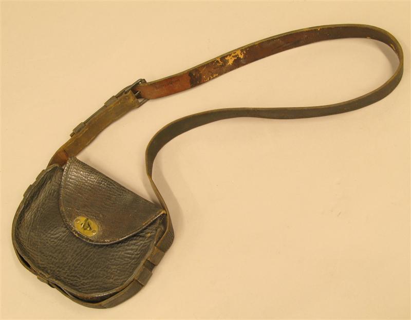 Model ... Patroontas en bandelier van zwart gelakt leer. Rond model met halfcirkelvormige klep. Rond een sleufje in de klep is op de boven- en onderzijde van de klep een koperen plaatje aangebracht. Op de voorzijde van de tas is een koperen draaisluiting bevestigd. Op de binnenzijde onder de sluiting is een lapje leer genaaid ter versteviging. Op de achterzijde (binnen) zijn 2 zakjes genaaid. Op beide zijkanten van de tas zijn 2 zwarte leren lussen genaaid, op de onderkant een. Riem van zwarte metalen gesp en 2 leren lussen. Achterkant bruin. Langs de zijkanten een ingeperste rand.
