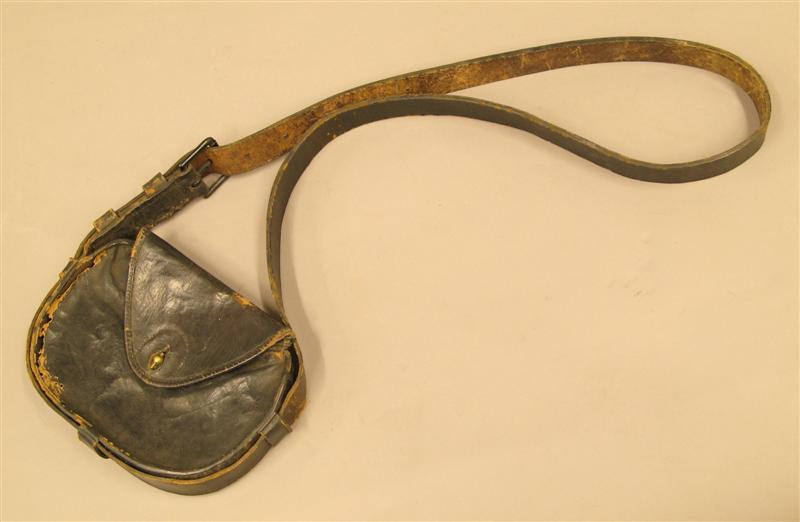 Model ..., voor Beaumontgeweer. Patroontas en bandelier van zwart gelakt leer. Rond model met driehoekige klep met knoopsgat. Op de onderzijde is rondom het knoopsgat een versteviging van leer aangebracht. Klep en bovenkant tas gebiesd met een reep zwart leer. Op de voorzijde van de tas een koperen sluiting. In de tas tegen de achterzijde 2 bruine leren zakjes. Riem met zwarte metalen gesp en 2 leren lussen. Achterkant bruin. Langs de zijkanten ingeperste randen. Achterkant riem bruin. Op de beide zijkanten en de onderkant van de tas zijn leren lussen (totaal 3) genaaid, waardoor de riem geschoven is.