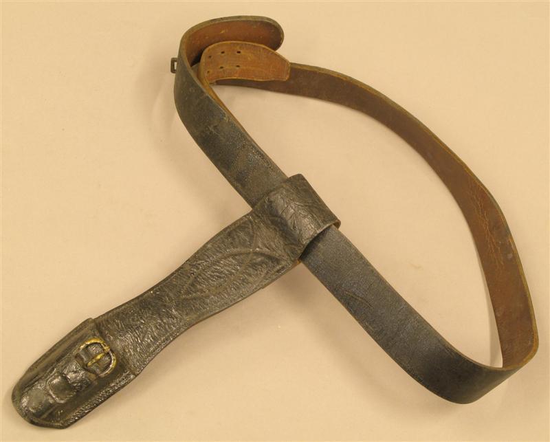 - BeschrijvingKoppel van zwart gelakt leer. Onderzijde bruin. De koppel wordt gesloten met een koperen gesp (gladde plaat) en oog. De gesp is verstelbaar bevestigd aan een leren riempje op de onderkant van de koppel. In dit riempje 2 rijen van 10 gaatjes. Op een uiteinde van de riem is een stukje leer genaaid, waaraan het oog is bevestigd.