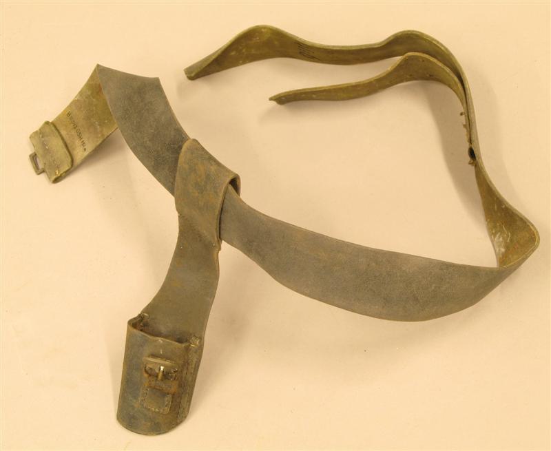 Zwartgelakt leren koppel, te sluiten met een koppelplaat en een koperen oog. Op de achterzijde van de koppel een riem met 2 rijen van 7 gaatjes