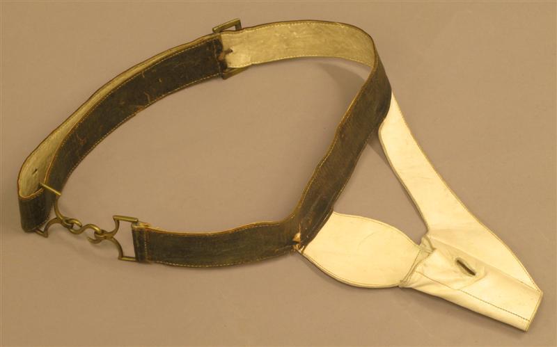 Model 27 febr. 1815, voor officieren. Koppel van zwart leer, gevoerd met wit leer. Koperen gesp (vierkant). Koperen slot: 2 fantasie beugels en slang. Degendrager van wit leer met bevestigingssleuf op de voorkant. Op de riem, achter de bevestiging van de degendrager, een lapje witte katoenen satijn. Wordt onder de rok gedragen.
