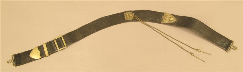 Model 1868, voor officier. Zwarte leren bandelier met koperen haken. Sluiting met schuifgesp van blank (verzilverd?) metaal, aan de achterzijde met aangezet leren riempje en metalen gespje. Schuifgesp met geschulpte binnenranden. Smalle metalen schuif van verzilverd(?) blank metaal. Op het einde van de bandelier een schildvormige plaat van blank (verzilverd?) metaal. Op het midden van de band een metalen leeuwekop een ring in de bek houdend, waaraan 2 koperen kettingen met aan iedere ketting een metalen ruimnaald. Schildvormige metalen plaat met versierde rand en op het midden een granaat. Op de achterzijde leren stukjes onder de metalen plaat en de leeuwekop.