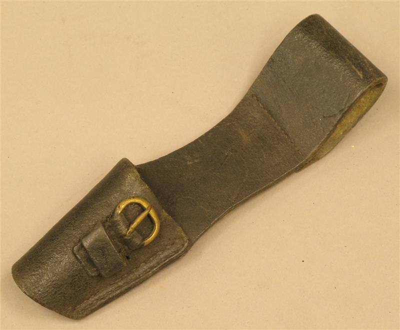 Zwarte leren bajonetdrager met koperen gespje aan riempje.