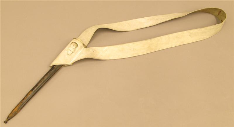 Model ca 1815. Bajonetschede van zwart leer. Bovenband en riempje wit leer. Onder aan de schede een zwart bolletje.