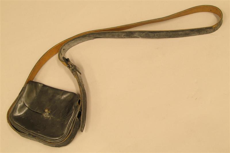 Zwarte leren patroontas met bandelier, buitenmodel. Rechte klep met afgeronde hoeken en een knoopsgat. Tas rechthoekig met afgeronde hoeken. Op de voorkant een koperen sluiting met vaste pin, bevestigd op een extra stukje leer. In de naden een zwarte leren bies. Op beide zijkanten en de onderkant een zwarte leren lus waardoor de riem geschoven is. Riem zwart met metalen gesp en een leren lus. Achterkant riem bruin.