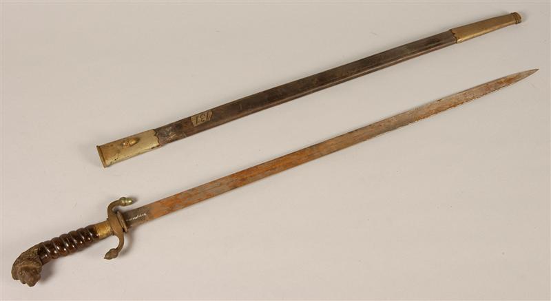 Sabelschede van zwart leer. Koperen bovenband met koperen knoop in de vorm van een eikel. Koperen onderband.