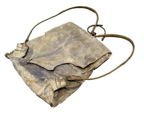 - BeschrijvingRugtas van perkament. Uit een stuk gemaakt (géén naden: het hele 'beest' is als zak met klep gebruikt). In beide achterpoten een lus van touw. In de nek een lus vastgemaakt aan een stokje. Aan de lussen 2 rieten gevlochten draagbanden. Voorpoten omgeslagen onder de klep. Mogelijk afkomstig van en gebruikt in Indonesië.
