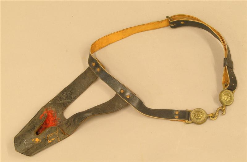 - BeschrijvingZwarte leren koppel, van voren gesloten met een koperen S-haak en 2 leeuwekoppen. Om de koppel een leren lus en een koperen gesp. Aan de koppel genaaid een zwarte leren sabeldrager. Achterzijde koppel en drager bruin.