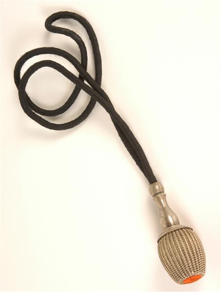 - BeschrijvingModel 1866, voor hoofdofficier en kapitein. Kwast van 22 zilveren bouillons van oversponnen massief pletzilver, waartussen zilverdraad. Bodem van oranje zijden garen. Peer en 4 randjes van glad metaal. Zwart wollen gevlochten koord.