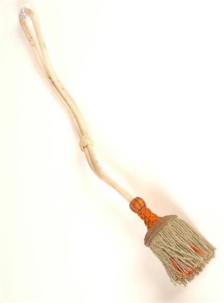 Model 1865, voor onderofficier. Kwast: franje van oranje wollen koord en zilverdraad. Oranje wollen genette peer. 4 randjes van dik koord, oversponnen met zilverdraad en oranje zijde. Schuiver boven peer oversponnen met oranje zijde en zilverdraad. Schuiver van witte gevlochten wol. Wit wollen gevlochten koord.