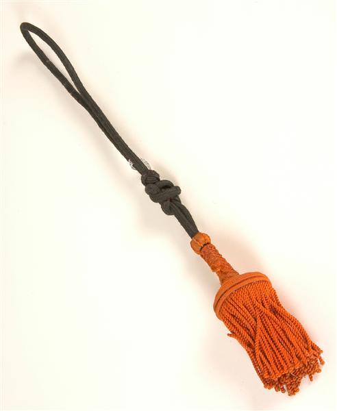 - BeschrijvingModel 1865 voor korporaal. Kwast van oranje wollen koord. Peer oversponnen met oranje zijde en genet met oranje wol. 7 randjes van dik oranje wollen koord. Schuiver boven de peer oversponnen met oranje zijde en oranje wol. Zwart wollen gevlochten koord waarin een sierknoop. Schuiver van zwarte gevlochte wol.