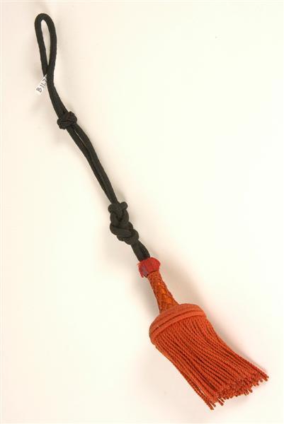 - DescriptionModel 1865, voor korporaal. Kwast van oranje wollen koord. Peer oversponnen met oranje zijde en genet met oranje wol. 7 randjes van dik oranje wollen koord. Schuiver boven de peer oversponnen met oranje wollen garen en koord. Zwart wollen gevlochten koord waarin een sierknoop. Zwarte wollen gevlochten schuiver.