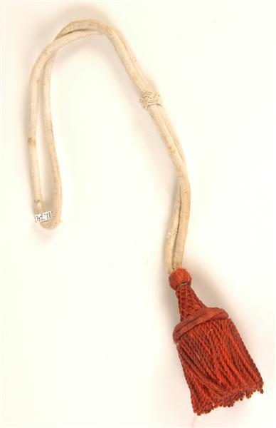 - BeschrijvingBuitenmodel, voor korporaal. Kwast van oranje-rood wollen koord. Peer oversponnen en genet met oranje-rode wol. 4 randjes van dik koord oversponnen met oranje-rode wol. Schuiver boven peer oversponnen met wollen garen en koord in dezelfde kleur. Wit wollen gevlochten koord. Schuiver van witte gevlochten wol.
