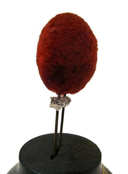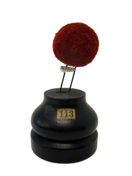 - BeschrijvingModel mogelijk 1844-1854. Bal van rode wol op een koperen beugel. Bal voor en achter afgeplat. De beugel is in een klos van zwart gelakt gedraaid hout gestoken.