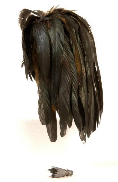 - BeschrijvingModel 4 april 1868, voor officier der artillerie. Pluim van zwarte haneveren, bevestigd op een koperen beugel. Bevestigingsplaats omwikkeld met zwart band. Over de beugel is een verzilverde (?) metalen tulp geschoven. Tulp met scherpe punten en parelrandjes.
