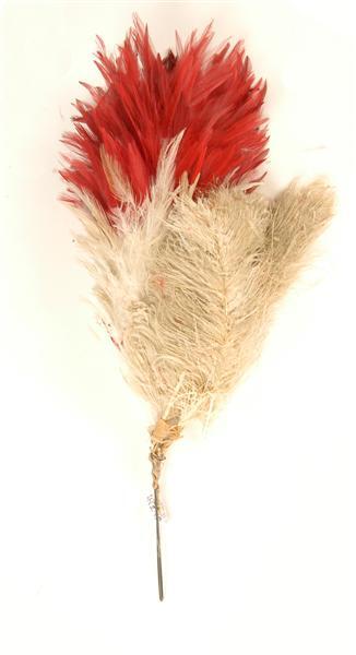 - BeschrijvingModel 17 okt. 1828, voor tamboer-majoor. Pluim van witte en rode veren, bevestigd op een metalen beugel. Veren bevestigd met laitondraad. Witte veren onder, rode boven. Om de witte veren zijn 3 witte struis(?) veren gebonden. De schachten zijn met wit garen verstevigd.