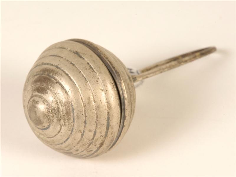 Blank metalen bal met beugel van koperdraad. Bal met gladde concentrische ringen. Voorzien van 'zilver-laag' (?).