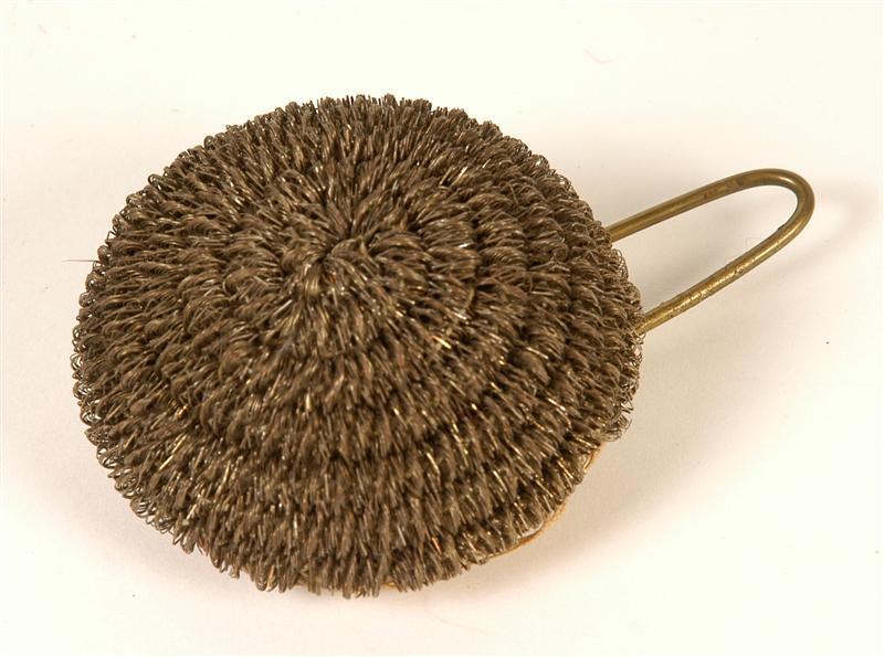 - BeschrijvingBal van spiraalvormig rond gelegd zilverbouillon. Onderzijde papier bespannen met zilverbrokaat. Beugel van koperdraad. Onderzijde vlak. Model 1854, voor officier.