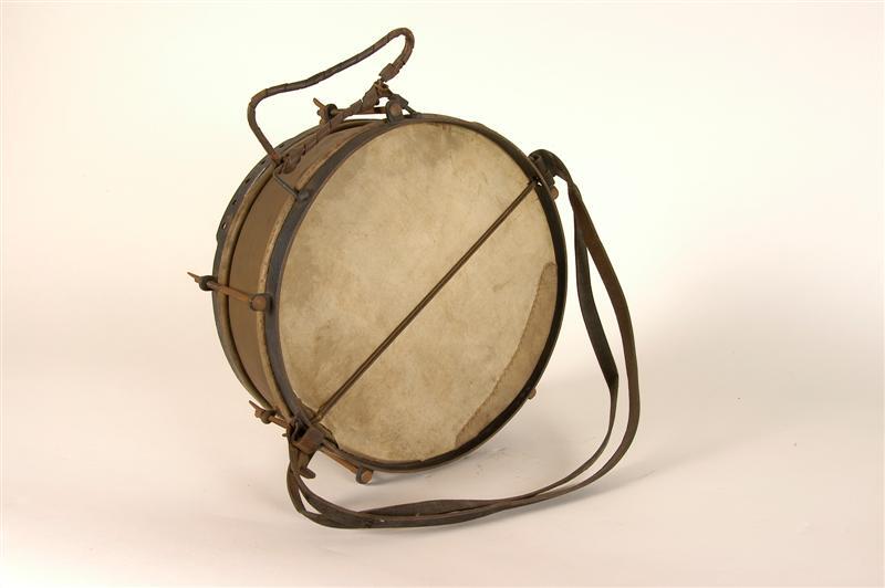 - BeschrijvingModel 1856. Geelkoperen ketel, blauw geschilderde metalen ringen. (Geite?)vellen. Op het ondervel 2 darmsnaren, op de ketel gespannen met behulp van een bout met haak en een vleugelmoer. Ringen gespannen met vijf spanschroeven. Metalen kniebeugel omwikkeld met een reep leer. Leren draagband grotendeels in de lengte doorgesneden.