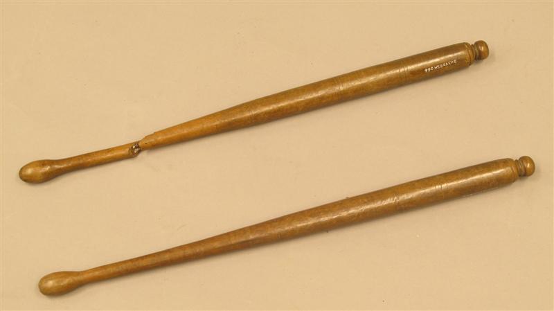 Model ... 2 bruine houten stokken, ieder met 10 ingesneden ringen en bovenop een gedraaid houten bolletje.