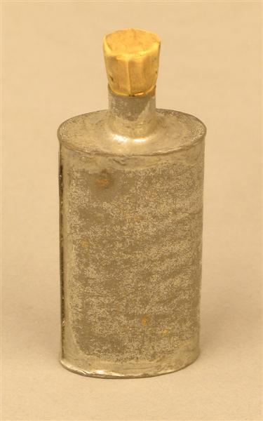 - BeschrijvingBlikken flesje, afgesloten met een kurk. In de onderkant van de kurk is een veertje gestoken.