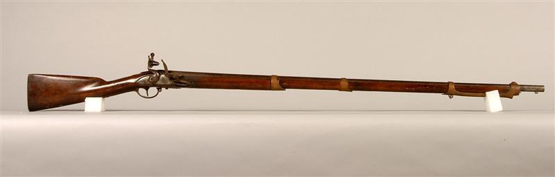 - BeschrijvingVuursteengeweer voor officier uit de bataafse republiek. Met schachtbajonet zonder stormring en laadstok. Roodkoperen banden, versierd met een vlaggentrofee. Geelkoperen beugel, kolfplaat en zijplaat ook versierd. Koperen plaatje op de greep omgeven door in hout gesneden krullen.