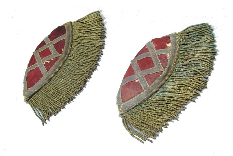 - BeschrijvingModel 17 oktober 1830, voor sergeant-tamboer (ook tamboer-majoor). Zwaluwnesten van rood laken, versierd met zilvergalon. Langs de onderkant een zilverkoord. Franje van (koperen?) goudkleurige torsade. Voering witte keper-katoen. Tussenvoering witte wol.