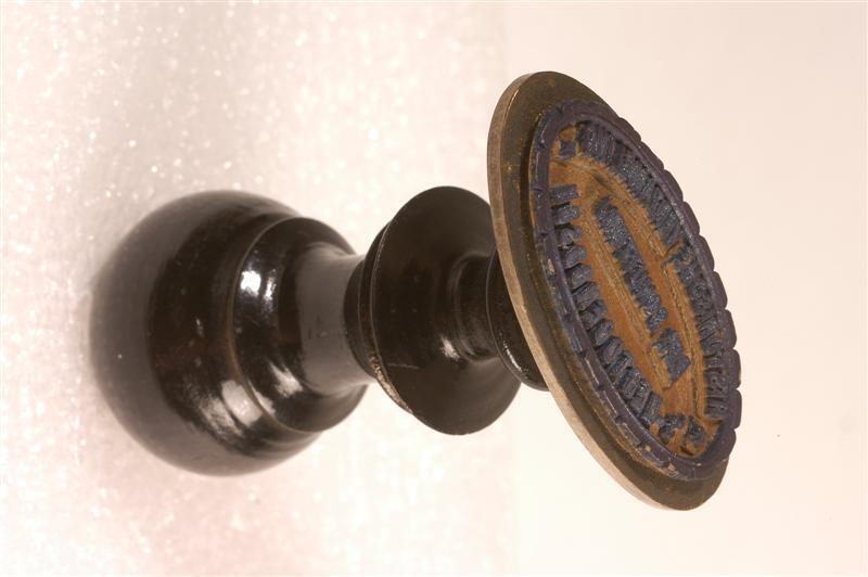 - BeschrijvingRubberen stempel, ovaal, met de tekst: "HISTORISCHE VERZAMELING / DER SCHUTTERIJ / 'S-HERTOGENBOSCH". Rubber gelijmd op ovale metalen plaat. Gedraaid houten handvat, zwart gelakt.