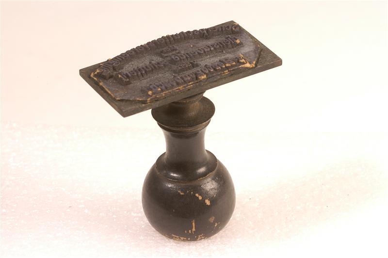 - BeschrijvingRubberen stempel met de tekst: "Scherpschuttersvereniging / der / dienstdoende / schutterij / van / 's-Hertogenbosch". Het rubber is gelijmd op een rechthoekige koperen plaat. Gedraaid houten handvat. Zwart gelakt.