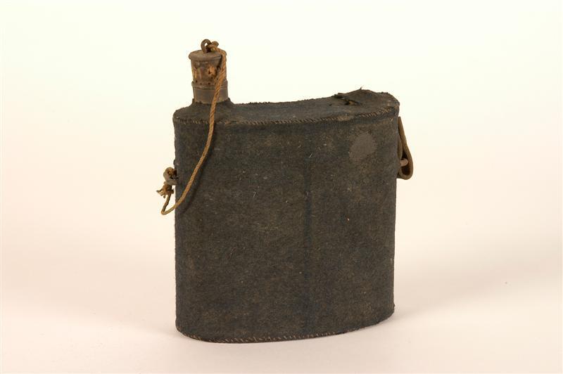 Metalen veldfles, overtrokken met donkerblauw laken. Afsluitkurk met metalen dop en oog. De kurk is met een touwtje verbonden aan een metalen beugeltje aan de zijkant van de fles. Door het beugeltje aan de andere zijde is een leren riempje gehaald. Het riempje is dubbelgevouwen en vastgezet met een dubbele koperen knoop. Tegenover de kurk is een open buisje in de bovenkant bevestigd. Waarschijnlijk model 1830, behorend bij veldtenue.