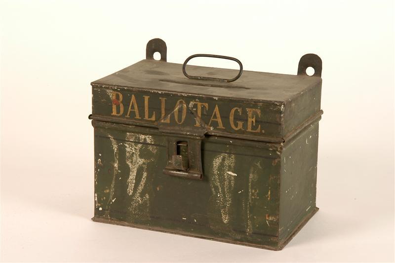 Ballotagebus der scherpschuttersvereniging, gevormd uit de schutterij. Rechthoekige blikken trommel met scharnierend deksel. Op het deksel een handgreep van metaaldraad, 2 ophangogen aan de achterzijde en een gleuf. Aan de voorkant van het deksel een scharnierende lip met gat, vallend over een metalen lus op de voorkant van de trommel. Trommel groen geverfd en versierd met zwarte randjes. Achter- en onderzijde zwart. Op de voorkant van de klep is met gele verf "BALLOTAGE" geschilderd. Mogelijk niet afkomstig van de Scherpschuttersvereniging (zoals A.J.J. v.d. Well vermeld in de catalogus)_ maar van de Schutterij-kaderbond, afd. 's-Hertogenbosch.
