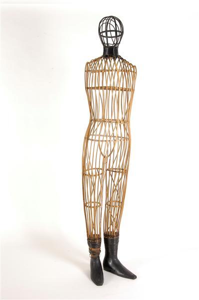 - BeschrijvingNaturel bamboe mannequin met houten kern in de hals en zwarte houten voeten. Om de hals en enkels is naturel gespleten bamboe gewikkeld.