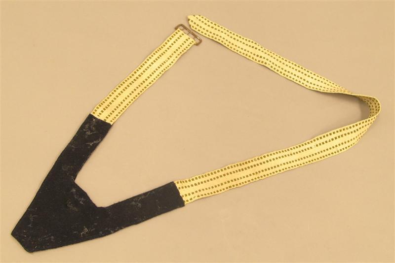 - BeschrijvingModel tot 1859, voor officier (?). Degendrager van donkerblauw laken, met de hand genaaid. Middenvoor een knoopsgat. Bovenaan zijn de 2 aangeknipte banden bevestigd aan wit wollen keperband. Band met ingeweven groene blokjes. Metalen gesp met 3 tongen bevestigd aan het keperband.