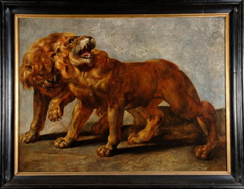De twee leeuwen zijn een getrouwe copie naar een detail van een schilderij van Rubens. Op het schilderij van Rubens trekken de twee leeuwen een zegekar, die allegorisch het huwelijk van Henri IV van Frankrijk met Maria de Medici voorstelt. Cupido is hier heer en meester over het span leeuwen. Emblematisch staat dit voor de kracht van de liefde die de meest woeste schepsels weet te temmen.