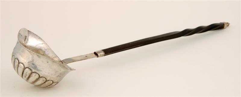 - BeschrijvingLepel met getorste steel. Ronde bak met een twintigtal knorren in de welving, gladde bovenrand uitlopend in een ovaal, met parelmoer afgezet de bak is met 2 klinknagels aan de steel bevestigd de steel heeft een gedeeltelijk getordeerd baleinen handvat dat met 5 nageltjes aan de steelaanzet is verbonden. Gedraaid zilveren knopje aan uiteinde steel.