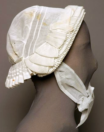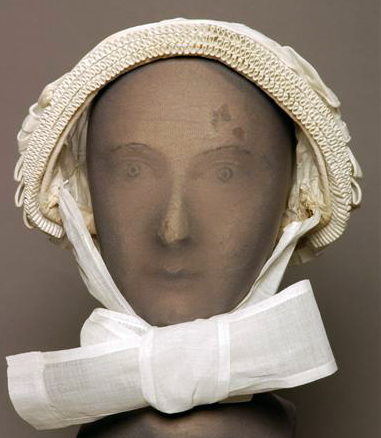 Geheel van neteldoek gemaakt. 3 geplooide voorstrookjes, dakpansgewijze boven elkaar genaaid. Over de strookjes een band met gerolde randen. In het midden eenmaal gedraaid, aan beide zijkanten in een strik opgenaaid. Breed schildje met 3 opnaadjes. Bodem met 3 opgenaaide schuine bandjes. Luifke met 2 opnaadjes, met stolpplooitjes aan de bodem gezet en verstevigd met wit sutiën. De hele rand van het mutsje is verstevigd met een band van gevlochten stro. Kinstrikken van neteldoek, aan een zijde ingenaaid, aan de andere zijde bevestigd met haak en oog.